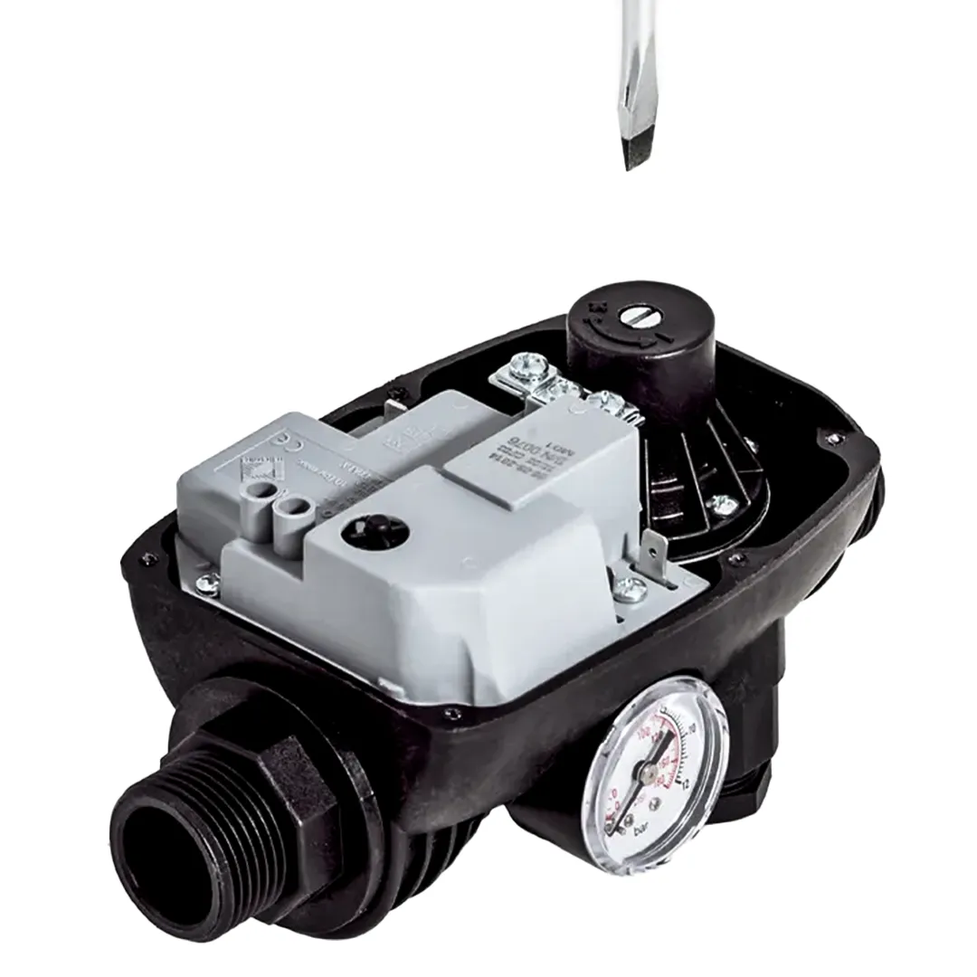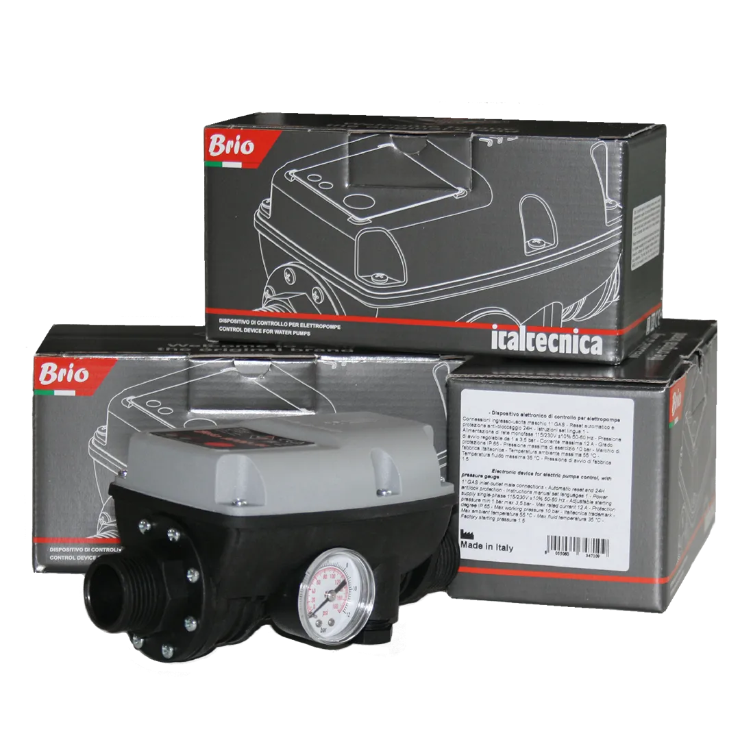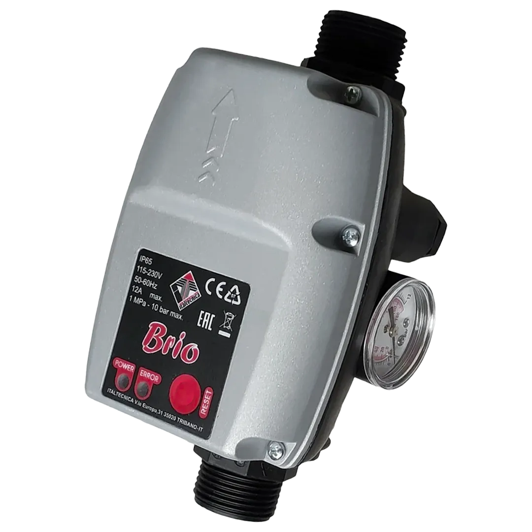 Реле давления Italtecnica BRIO2000 применяется для автоматического включения и выключения однофазных электронасосов мощностью до 2 л.с. Полностью заменяет традиционно используемые автоматические станции водоснабжения, состоящие из реле давления и гидроаккумулятора. Включает электронасос после падения давления в системе (открытые краны) и выключает его, когда прерывается поток воды при максимальном значении давления для электрического насоса (краны закрыты). Кнопка RESET (сброс) 2. Индикатор остановки (сухой ход) 3. Индикатор напряжения сети 4. Клеммы подключения насоса 5. Винт для регулировки давления срабатывания 6. Вход с резьбовым соединением 1" резьба="" наружная="" предзаказу="" внутренняя="" вращающая="" Подключения="null" питания="" Выход="null" с="" резьбовым="" соединением="" Манометр="null" в="" версии="">