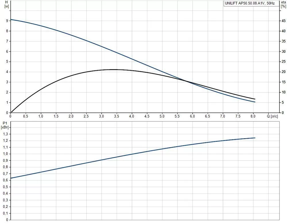 Графические характеристики дренажного насоса Grundfos Unilift AP 50.50.08.A1.V