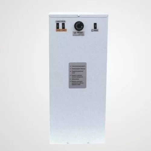 Электрический котел ЭРДО ЭВПМ-48 предназначен для водяного отопления зданий, имеющих открытую или закрытую отопительную систему, работающую при давлении не более 0,2 МПа (20 м водяного столба) при напряжении трёхфазной сети 380В или однофазной сети 220В. Электрокотлы могут использоваться в качестве основного или резервного источника теплоснабжения. Они не нуждаются в постоянном обслуживании, экологически безвредны и безопасны. Электроводонагреватель состоит из корпуса, стальной ёмкости, пульта управления, закреплённого внутри корпуса. В верхней части ёмкости, во фланце, смонтированы трубчатые электронагреватели. Элeктрoкoтёл имеет встроенный пульт управления, предназначенный для переключения мощности и регулирования температуры нагрева теплоносителя. Регулятором температуры элeктрoкoтла служит капиллярный термостат, термочувствительный элемент которого закреплён в средней части стальной ёмкости (резервуара). В котле имеется колодка для подключения циркуляционного насоса. Его включение (если он подключен к водонагревателю) производится клавишей, расположенной на лицевой панели водонагревателя. Для защиты от перегрева электроводонагреватель оборудован самовозвратным датчиком аварийного отключения (температура срабатывания 90†5 оС). Верхний напорный и нижний обратный патрубки предназначены для присоединения водонагревателя к системе отопления. На лицевой стороне водонагревателя расположена ручка регулятора температуры и клавиши переключения мощности. На задней части корпуса имеется сальник для ввода в пульт питающего кабеля и болт для крепления заземляющего провода. ЭВПМ-48 оснащён колодкой для подключения выносного комнатного терморегулятора.