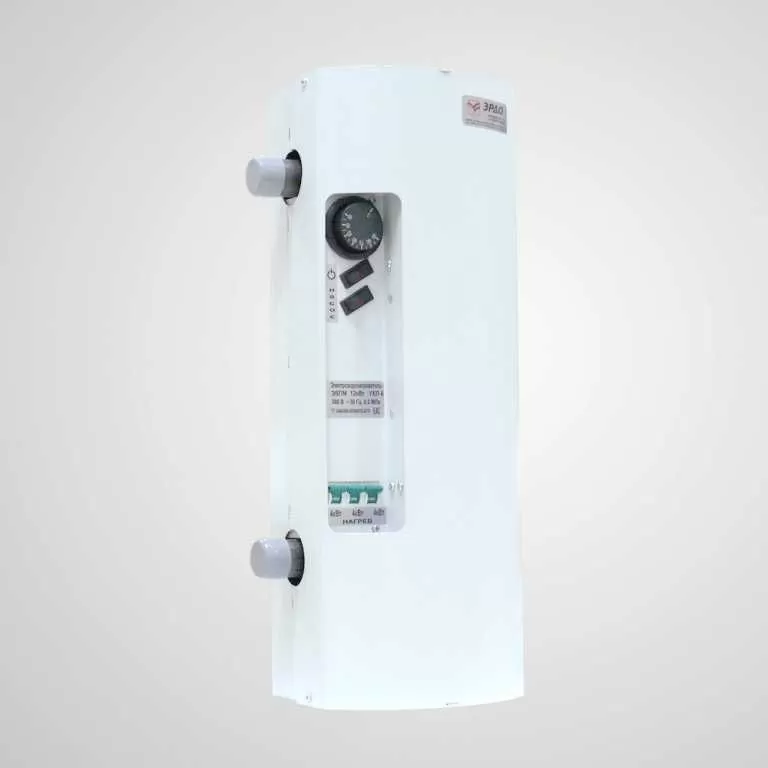 Электрический котел ЭРДО ЭВПМ-NEXT-12 предназначен для водяного отопления зданий, имеющих открытую или закрытую отопительную систему, работающую при давлении не более 0,2 МПа (20 м водяного столба) при напряжении трёхфазной сети 380В или однофазной сети 220В. Электрокотлы могут использоваться в качестве основного или резервного источника теплоснабжения. Они не нуждаются в постоянном обслуживании, экологически безвредны и безопасны. Электроводонагреватель состоит из корпуса, стальной ёмкости, пульта управления, закреплённого внутри корпуса. В верхней части ёмкости, во фланце, смонтированы трубчатые электронагреватели. Элeктрoкoтёл имеет встроенный пульт управления, предназначенный для переключения мощности и регулирования температуры нагрева теплоносителя. Регулятором температуры элeктрoкoтла служит капиллярный термостат, термочувствительный элемент которого закреплен в средней части стальной ёмкости (резервуара). В котле имеется колодка для подключения циркуляционного насоса. Его включение(если он подключен к водонагревателю) производится клавишей, расположенной на лицевой панели водонагревателя. Для защиты от перегрева электроводонагреватель оборудован самовозвратным датчиком аварийного отключения (температура срабатывания 90†5 оС). Верхний напорный и нижний обратный патрубки предназначены для присоединения водонагревателя к системе отопления. В электрокотле ЭВПМ-NEXT реализована возможность изменения расположения патрубков подачи и обратки относительно лицевой панели при монтаже изделия. На лицевой стороне водонагревателя расположена ручка регулятора температуры и клавиши переключения мощности. На нижней части корпуса имеется заглушка ступенчатая для ввода в пульт питающего кабеля. Болт для крепления заземляющего провода расположен внутри корпуса на кронштейне крепления колбы котла.