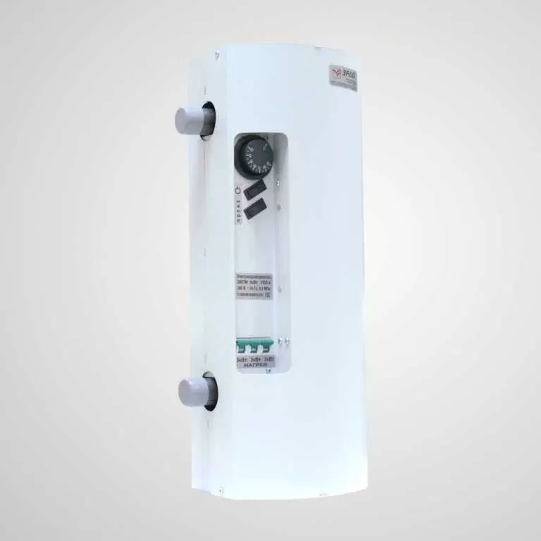Электрический котел ЭРДО ЭВПМ-NEXT-9 предназначен для водяного отопления зданий, имеющих открытую или закрытую отопительную систему, работающую при давлении не более 0,2 МПа (20 м водяного столба) при напряжении трёхфазной сети 380В или однофазной сети 220В. Электрокотлы могут использоваться в качетстве основного или резервного источника теплоснабжения. Они не нуждаются в постоянном обслуживании, экологически безвредны и безопасны. Электроводонагреватель состоит из корпуса, стальной ёмкости, пульта управления, закреплённого внутри корпуса. В верхней части ёмкости, во фланце, смонтированы трубчатые электронагреватели. Элeктрoкoтёл имеет встроенный пульт управления, предназначенный для переключения мощности и регулирования температуры нагрева теплоносителя. Регулятором температуры элeктрoкoтла служит капиллярный термостат, термочувствительный элемент которого закреплён в средней части стальной ёмкости (резервуара). В котле имеется колодка для подключения циркуляционного насоса. Его включение (если он подключен к водонагревателю) производится клавишей, расположенной на лицевой панели электрокотла. Для защиты от перегрева электроводонагреватель оборудован самовозвратным датчиком аварийного отключения (температура срабатывания 90†5 оС). Верхний напорный и нижний обратный патрубки предназначены для присоединения водонагревателя к системе отопления. В электрокотле ЭВПМ-NEXT реализована возможность изменения расположения патрубков подачи и обратки относительно лицевой панели при монтаже изделия. На лицевой стороне водонагревателя расположена ручка регулятора температуры и клавиши переключения мощности. На нижней части корпуса имеется заглушка ступенчатая для ввода в пульт питающего кабеля. Болт для крепления заземляющего провода расположен внутри корпуса на кронштейне крепления колбы котла.