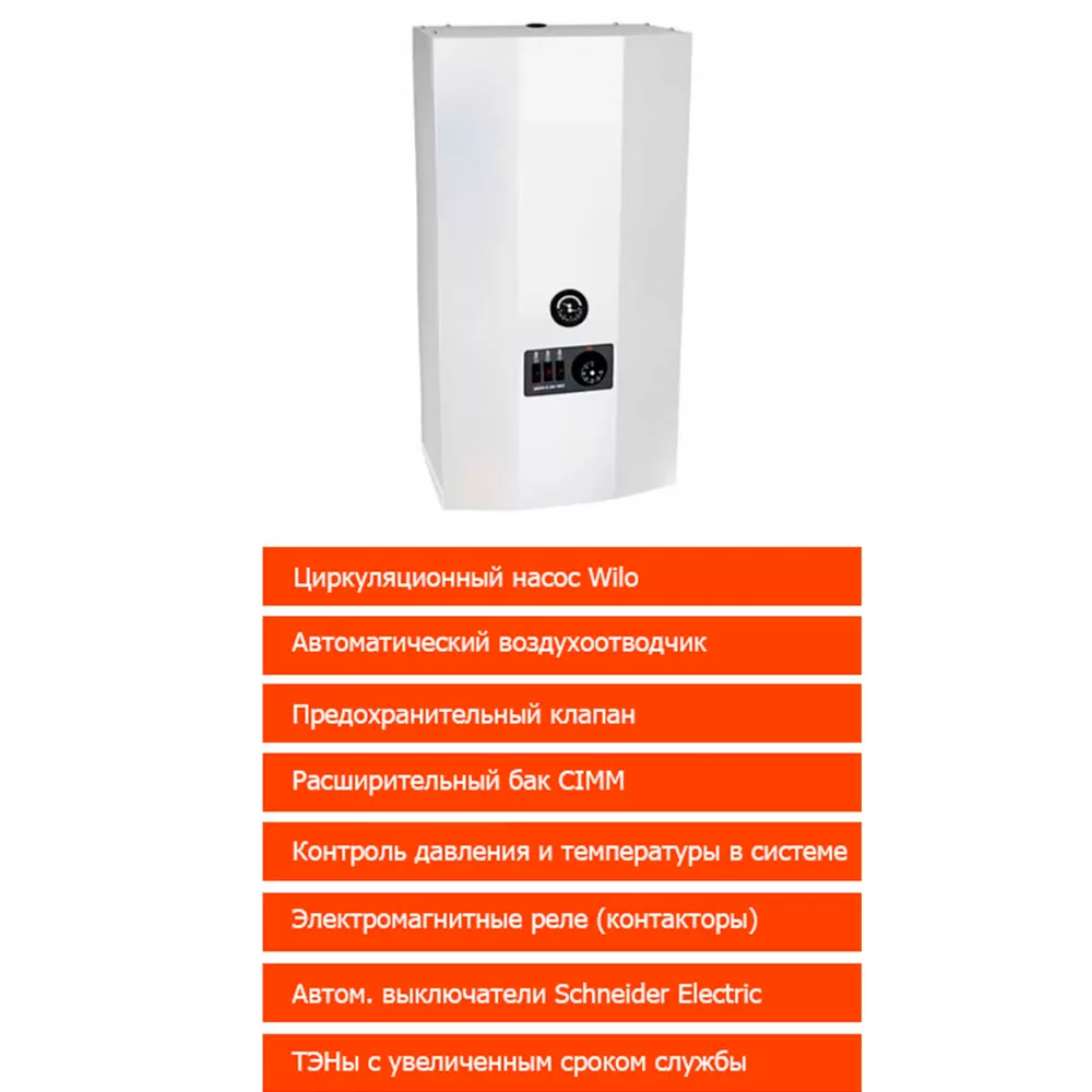 В конструкции котла предусмотрены элементы обвязки – сняв переднюю панель, мы увидим расширительный бак на 6 литров, циркуляционный насос и группу безопасности. Здесь же располагается автоматический спускник воздуха. За коммутацию нагревательных элементов отвечают электромагнитные реле. Безопасность обеспечивается автоматическими выключателями от компании Schneider Electric. Котёл предназначен для работы в отопительных системах замкнутого типа с принудительной циркуляцией теплоносителя.