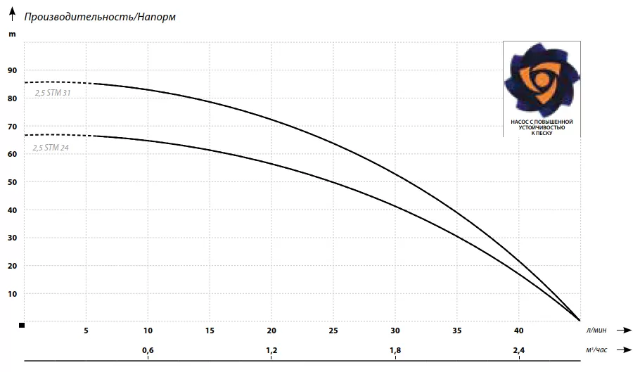 Многоступенчатые скважинный насосы диаметром 66 мм с повышенной устойчивостью к песку, рассчитанные на 3 и 4–дюймовые скважины. Насос IBO 2,5STM 31 обладает повышенной эффективностью к содержанию песка в перекачиваемой жидкости. Устойчивость к песку был достигнут благодаря использованию «плавающих лопастных колес» и выбору износостойких материалов. Скважинный насос IBO 2,5STM 31 обладает отменными характеристиками для насоса с небольшим диаметром. Максимальный напор насоса ИБО составляет 85 м, при этом максимальная производительность в пиковой точки показывает 2.7 м³/час. При таких напорно-расходных характеристиках мощность двигателя составляет всего 550 Вт. Конденсатор насоса встроен в двигатель, благодаря чему электрическая установка намного проще, чем в случае насосов со стартовой коробкой. Насос оснащен тепловой защитой, установленной в обмотке двигателя. Насос комплектуется кабелем 1 м. Основным преимуществом насоса IBO 2,5STM 31 является чрезвычайно высокая производительность для насоса диаметром 66 мм со скоростью до 2.7 м³/час.