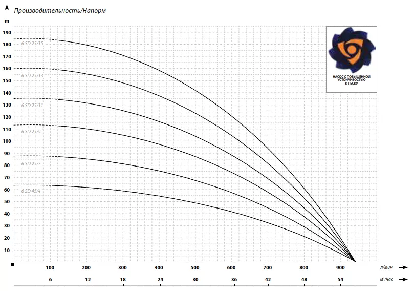 Трехфазный скважинный погружной насос IBO 6SD 25/15 диаметром 146 мм с повышенной устойчивостью к песку. Насос IBO 6SD 25/15 доступен к покупке с двигателями IBO и итальянскими двигателями IBO ITALY. В насосе IBO 6SD 25/15 используется технология «плавающих лопастных колес», а также для основных рабочих элементов насоса применяются износостойкие материалы: латунный нагнетательный патрубок, корпус, вал и сетка фильтра выполнены из нержавеющей стали AISI 304 / а также лопастные колеса выполнены из высококачественной пластмассы, Благодаря этому насос IBO 6SD 25/15 имеет повышенную стойкость к песку. Насос комплектуется кабелем 1 м, по желанию его можно нарастить до нужного размера. Скважинный насос IBO 6SD 25/15 имеет отличные характеристики. Напор насоса в максимальной точке составляет 185 м, а производительность достигает максимального показателя в 55.2 м³/час. Мощность двигателя составляет 15000 Вт, то вполне неплохо для насоса с такими напорно-расходными характеристиками. Насосы серии SD марки ИБО были первыми насосами на рынке, названными «анти–песочными». Они по прежнему являются одними из немногих скважинных насосов на рынке, которые имеют конструкции с такой высокой устойчивостью к песку. Максимальное содержание песка в воде – до 5%. Насос IBO 6SD 25/15 можно применять как аналог насосов ЭЦВ.