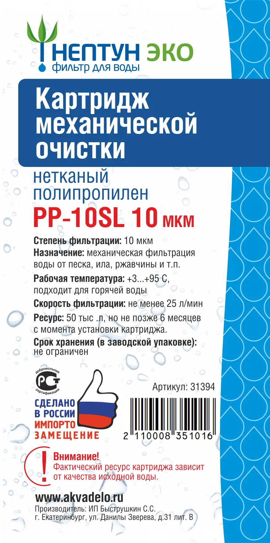 Универсальность: Совместим со стандартными бытовыми фильтр-системами 10SL большинства производителей (включая Аквафор, Барьер, Гейзер). Устанавливается в качестве первой ступени фильтрации.