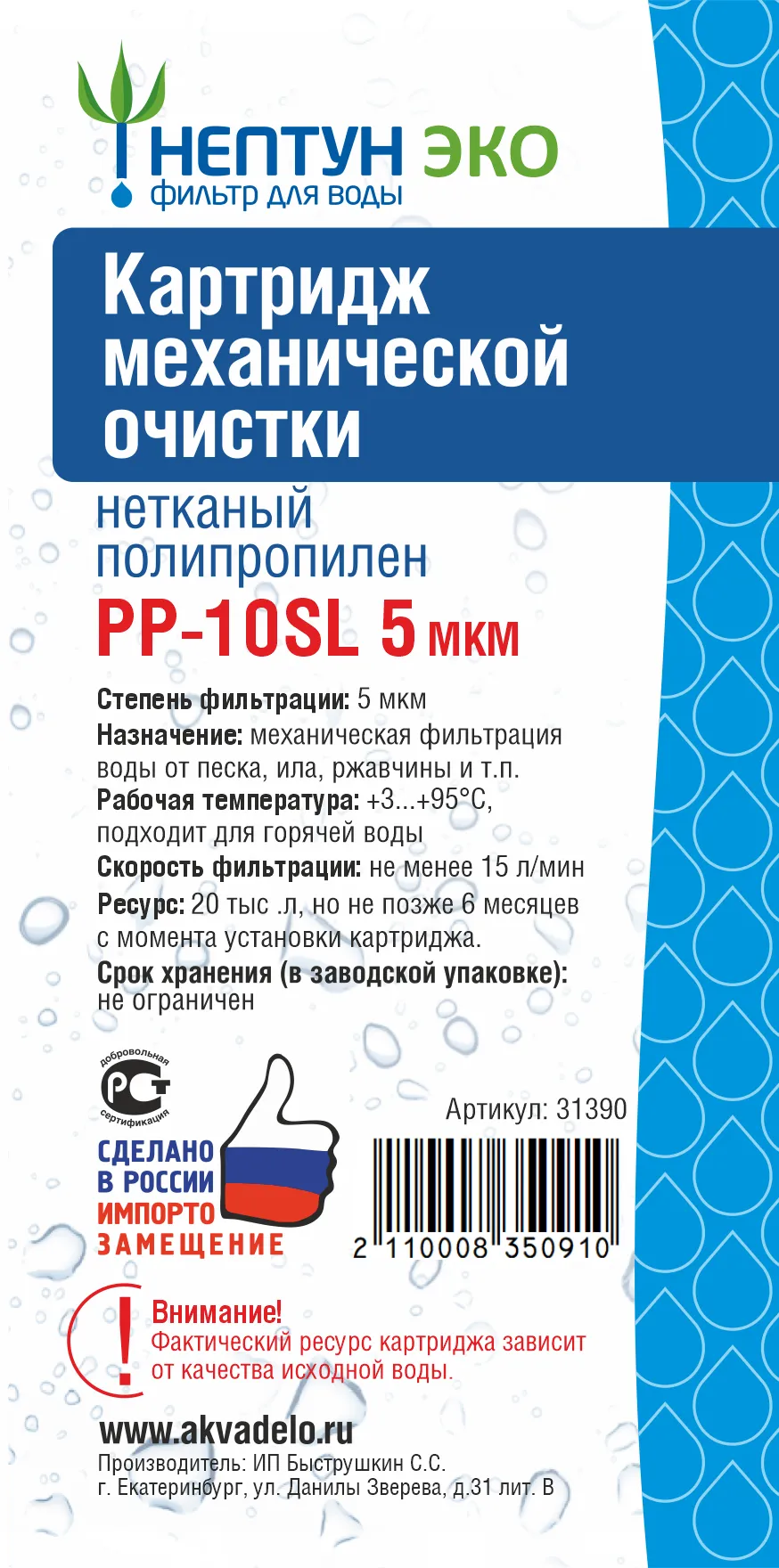 Картридж предназначен для механической очистки воды от нерастворимых примесей, таких как песок, ил, глина, ржавчина и другие.