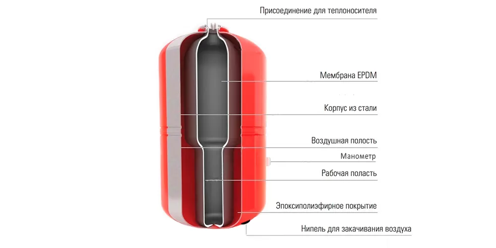 Расширительный бак Wester WRV 3000 предназначен для компенсации температурного расширения теплоносителя в замкнутых системах отопления. Корпус гидроаккумулятора выполняется из углеродистой стали с эпоксиполиполиэфирным наружным покрытием красного цвета RAL 3020. Сменная мембрана изготавливается из высококачественного материала EPDM, обладающим благоприятными механическими свойствами и очень широким температурным диапазоном применения, что позволяет использовать ее для горячей воды. В качестве теплоносителя допускается использование воды или водного раствора гликоля с концентрацией до 50%. Баки снабжены рабочими штуцерами для подключения к системе отопления диаметром 3". Максимальное рабочее давление для данной модели составляет 10 бар. Мембранный бак для отопления WRV 3000 оснащен держателем мембраны, к которому можно подключить манометр. Также модель имеет специальные стойки у основания бака для установки в вертикальном положении.