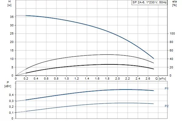 Насос Grundfos SP 2A-6 создан с применением новейших гидравлических технологий. Grundfos SP 2A-6 созданные специально для того, чтобы обеспечивать максимальную эффективность в периоды высокой нагрузки, насос имеет низкую стоимость и высокую надёжность эксплуатации вне зависимости от вида назначения. Grundfos SP 2A-6 обеспечивает высокую эффективность, высокое сопротивление абразивному износу (песку и иным абразивам), защиту от перегрева двигателя и простоту технического обслуживания. Также доступна готовая к применению система контроля и управления, предназначенная для постоянной оптимизации работы насосной системы. Максимальная производительность насоса 2.6 м3/час, максимальный напор 36 м при мощности электродвигателя 370 Вт. Насос работает от сети 220 в. Гарантийный срок на насос Grundfos SP 2A-6 составляет 2 года.