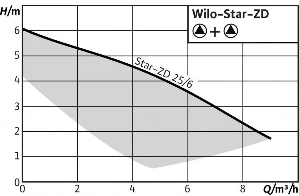 Циркуляционный насос WILO STAR-ZD 25/6 для систем ГВС, сдвоенный насос с мокрым ротором в общем корпусе с перекидным клапаном, для установки в трубах с резьбовым соединением, устойчивый к токам блокировки электродвигатель и ручное трехступенчатое переключение частоты вращения. Корпус насоса из бронзы, рабочее колесо из синтетического материала, керамический вал, пропитанные синтетической смолой угольные подшипники скольжения.